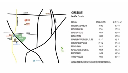 地鐵8號線膠東機場站(入膠東機場口)青島北站方向至青島北站(9站),換乘1號線東郭莊方向至鳳崗路站(C出口,9站),步行285米到達酒店,全程約1小時19分鐘。