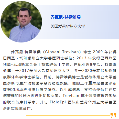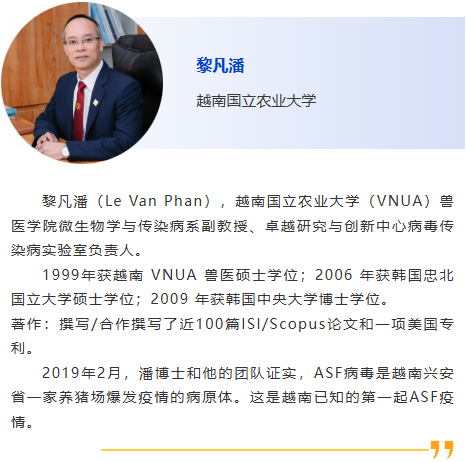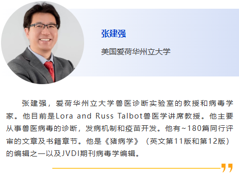 8:30am – 根據全球 ORF5 序列完善 PRRSV-1 的遺傳分類并研究其地理和時間分布,張建強,愛荷華州立大學 9:00am - 越南非洲豬瘟疫情及疫苗研發最新進展, Le Van Phan, 越南國立農業大學 9:30am – 贊助商報告 10:00am - 休息 10:30am –二代測序在美國豬養殖行業中的應用,Giovani Trevisan,愛荷華州立大學 11:00am - 非洲豬瘟和藍耳病的免疫學診斷,朱建中,揚州大學 11:30am –豬場疫病檢測監測體系研究,張安定,華中農業大學 |