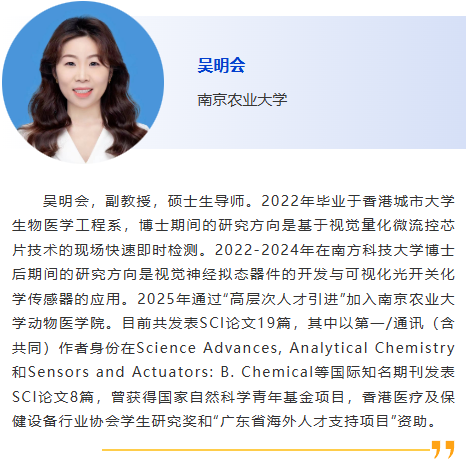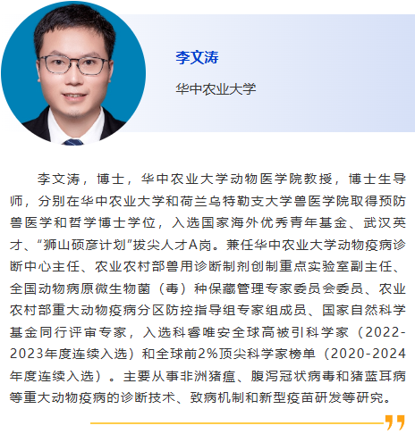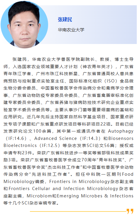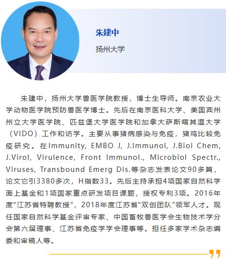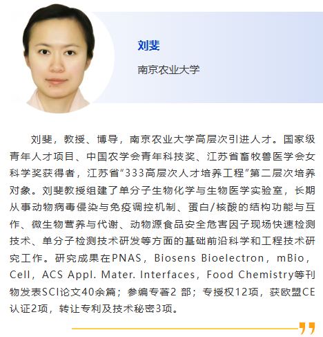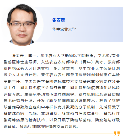 8:30am –利用CRISPR技術作為廣譜跨屬抗病毒療法快速應對病毒威脅:以非洲豬瘟為例及其拓展研究,Douglas Gladue, Seeklabs 9:00am - 幾種豬重要病原現場快速檢測技術研究,劉斐,南京農業大學 9:30am - 贊助商報告 10:00am - 10:30am 休息, 參觀展覽 10:30am –豬病毒性腹瀉mRNA疫苗研究進展,李彬,江蘇省農業科學院 11:00am - 使用新型 p30 單克隆抗體偶聯石墨烯場效應晶體管進行超靈敏、快速、實時監測 ASFV 檢測 基于p30單克隆抗體共軛石墨烯場效應晶體管的超靈敏、快速、實時非洲豬瘟病毒(ASFV)新型檢測技術,鄭龍三,南京農業大學 11:30am - 用于畜禽疫病快速篩查的視覺傳感智能檢測技術面向畜禽疫病快速篩查的視覺傳感智能檢測技術研究,吳明會,南京農業大學 |
