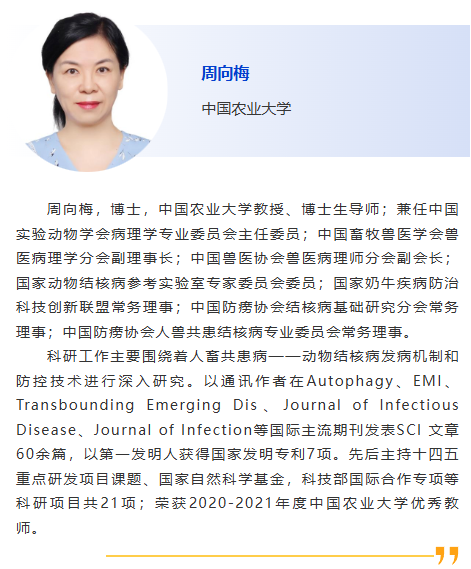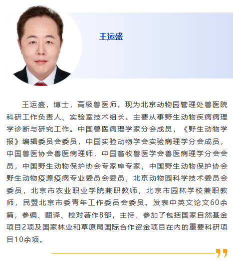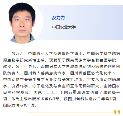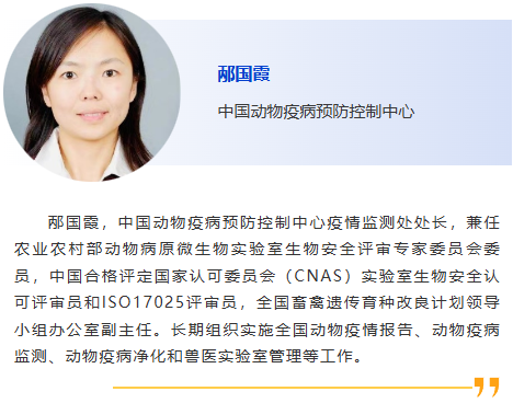 1:30pm – 我國動物疫病監測預警制度介紹,邴國霞,中國動物疫病預防控制中心 2:00pm – 人獸共患結核病流行現狀與應對措施,樊曉旭,中國動物衛生與流行病學中心 2:30pm – 贊助商報告 3:00pm – 休息 3:30pm – 跨境野生動物疫病病理學診斷,王運盛,北京動物園 4:00pm – 基于數據挖掘的牛羊布病真實年感染率的貝葉斯推斷,李樹博,遼寧省動物疫病預防控制中心 4:30pm – 中國豬群中PRRSV-1的鑒別檢測與流行演化,陳南華,揚州大學 |