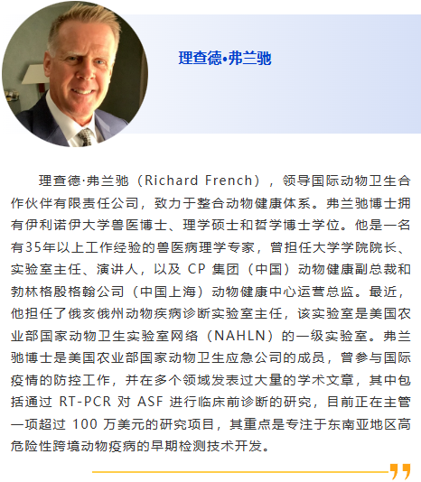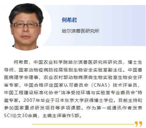 1:30pm – 使用免疫過氧化物酶單層試驗(IPMA)檢測和定量暴露于PEDV和ASFV后母豬初乳中的IgG和IgA水平,蘇普特·瓦塔納潘薩克,朱拉隆功大學 1:55pm - 動物病原高效富集和快速檢測,林建涵,中國農業大學 2:20pm –基于納米抗體的檢測PRRSV的雙抗體夾心ELISA方法及其應用,安同慶,哈爾濱獸醫研究所 2:40pm - 贊助商報告 3:00pm - 3:15pm 休息,參觀展覽和海報 3:15pm –豬呼吸道冠狀病毒(PRCV)的流行病學及分離株PRCV/NM的致病機制,劉平黃, 中國農業大學 3:40pm –SAA檢測技術的建立及其在馬傳染病診斷中的應用,胡哲,哈爾濱獸醫研究所 4:05pm –基于衣殼蛋白的地方性鼻腫瘤病毒抗原捕獲ELISA檢測方法的開發與應用,王雪峰,哈爾濱獸醫研究所 |