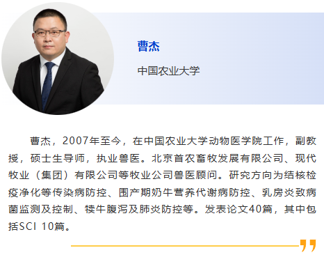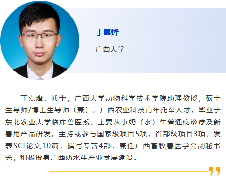 8:30am - 從私人獸醫的角度看出口診斷- 這些檢測真的是最適合您的出口要求并最有幫助的嗎? Em Mowrer, Stonehouse Veterinary Service 9:00am - 小型反芻動物- 不僅僅是小牛!如何處理這些小動物的寄生蟲和常見病,Em Mowrer, Stonehouse Veterinary Service 9:30am - 奶牛子宮內膜炎診斷治療進展,徐闖,中國農業大學 10:00am - 休息 10:30am - 規模化牧場奶牛乳腺炎診斷及防控要點,王亨,揚州大學 11:00am - 牛支原體分離株的分子流行病學特征及致病性研究,潘子豪,南京農業大學 11:30am –我國犢牛腹瀉的病因、診斷及防控策略研究進展,尹鑫,哈爾濱獸醫研究所 |