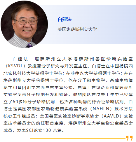 8:30am - 牛γ皰疹病毒4型TaqMan熒光定量PCR檢測方法的建立及應用基于TaqMan的牛γ皰疹病毒4型實時PCR檢測方法的建立及應用,伍海亮,黑龍江八一農墾大學 8:45am - 豬繁殖與呼吸綜合征病毒 N 蛋白間接 ELISA方法的建立及應用,劉婉悅,中國農業大學 9:00am - 豬塞內卡病毒 A VP2-VP3-VP1 和 3AB-3C 抗體雙重檢測的可鑒別感染與免疫動物(DIVA)的蛋白質芯片平臺的開發與應用,李德昕,揚州大學 9:15am - 基于CRISPR的布氏桿菌野毒株與減毒疫苗株的快速精準鑒別檢測,張璐璐,中國農業科學院農業基因組研究所 9:30am - 數字X線攝影與肺臟病理評分(CLP)在離體豬肺模型中的對比性研究,王泓祥,南京農業大學 9:45am - 贊助商報告 10:00am - 休息 10:30am - 布魯氏菌 S2 疫苗株鑒別型qPCR 檢測方法的建立,謝銘銘,內蒙古農業大學 10:45am - 基于免疫球蛋白結合蛋白ELISA的開發與評估:用于家畜口蹄疫的血清學診斷,常益銘,東北農業大學 11:00am - 布魯氏菌磁微粒競爭化學發光抗體檢測方法的建立與應用,宋國棟,蘭州獸醫研究所 11:15am –無乳鏈球菌鑒別培養基的研制,何少巖,南京農業大學 11:30am –一種新型高敏感性、高特異性雙重酶激活差異探針PCR方法,用于滑液囊支原體MS-H疫苗株與野生型菌株的SNP檢測和區分,劉瑞東,華南農業大學 11:45am –總結與問答 |