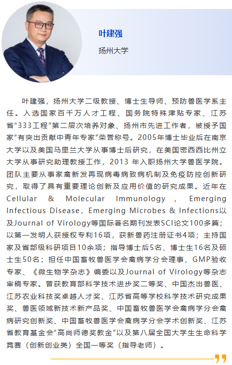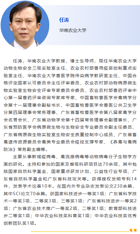 1:30pm – 禽流感病毒診斷方法的建立及初步應用,閆麗萍,南京農業大學 2:00pm – H9N2亞型禽流感防控的挑戰與對策, 孫怡朋,中國農業大學 2:30pm – 贊助商報告 3:00pm – 休息 3:30pm – 新城疫流行病學、檢測和預防技術研究,任濤,華南農業大學 4:00pm – 家禽免疫抑制病診斷技術的開發與應用,王永強,中國農業大學 4:30pm – 待定 |