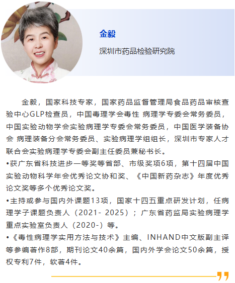 8:30am - 實驗病理學公益平臺:比較病理學病例總結、規劃及展望, 劉振軒,臺灣大學獸醫學院 9:00am – 流行豬病臨床病例綜合診斷,劉思當,山東農業大學 9:20am – 推動鴿藥創制與應用的思考,劉月煥,北京市農林科學院畜牧獸醫研究所 9:40am – 細粒棘球蚴對肝細胞損傷致病機制的研究,翟少華,新疆農業大學 10:00am –實驗病理學的歷史與未來展望:跨學科合作的橋梁與紐帶,遇秀玲,國家獸用藥品工程技術研究中心 10:00am - 10:30am 休息, 參觀展覽 毒性病理 主持人:白文霞,李曉瑜 10:30am – 國內GLP發展現狀和問題,袁伯俊,海軍軍醫大學 10:50am – 大鼠博來霉素肺纖維化病理分析,蘇寧,東南大學 11:10am –眼內給藥技術的探索與應用,王俐梅,廣州灣區生物醫藥研究院 11:30am – 大鼠灌胃引起的反流及其在非臨床研究中的鑒別,胡建廷, 山東省藥學科學院新藥評價中心 11:50am – 藥物非臨床安全性評價中肺臟病變案例分享,楊沁,北京協和建昊醫藥技術開發有限責任公司 12:10am - 老年動物胰島損傷模型病理學觀察與分析,宋志琦,中國醫學科學院醫學實驗動物研究所 |