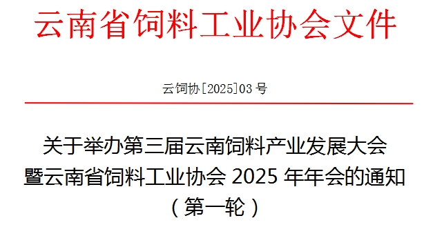 2025年,是全面貫徹黨的二十屆三中全會精神的開局之年,也是實施“十四五”規劃收官與謀劃“十五五”發展藍圖的關鍵之年。在全球經濟格局重構、科技革命加速背景下,飼料行業正面臨質量升級、綠色轉型、智能化突破的歷史性機遇與挑戰,正處在變革與發展的關鍵節點。為凝聚行業共識、推動技術創新、探索高質量發展路徑,云南省飼料工業協會將以“數智賦能 創新突圍 鏈動未來”為主題,于2025年7月在昆明舉辦第三屆云南飼料產業發展大會暨云南省飼料工業協會2025年年會,屆時將邀請行業相關領導、行業專家以及企業精英共同分析、探討行業形勢和前沿,為行業以及會員單位搭建一個交流與學習的專業平臺,推動我省飼料工業可持續、高質量的發展?,F將有關事宜通知如下: