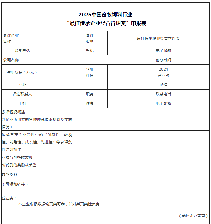 4、表彰階段(12月6日)。最后結果將在“2025第22屆畜牧飼料科技與經濟高層論壇頒獎”儀式上公布“2025中國畜牧飼料行業——最佳傳承企業經營管理獎”獲獎企業名單并頒獎。