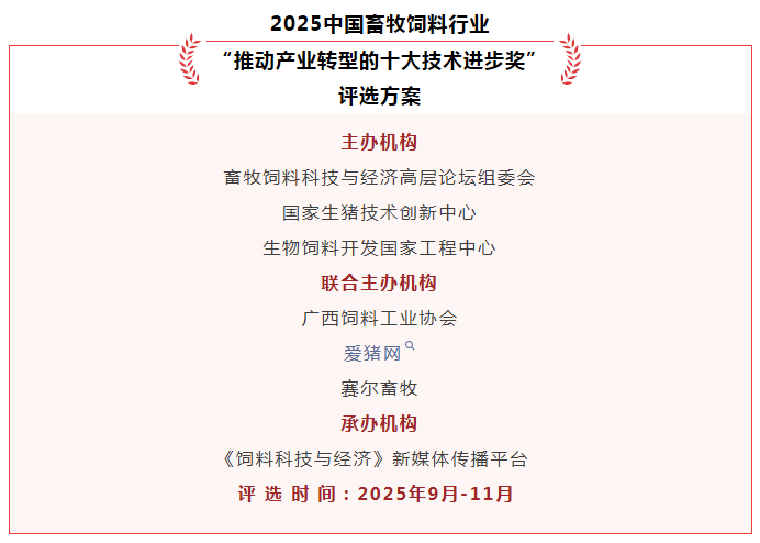 為了表彰那些在畜牧飼料業關鍵領域取得重大突破、產生顯著經濟、社會和環境效益的技術創新成果;引導行業樹立技術發展的風向標和標桿,明確未來投資和研發的重點方向;加速先進適用技術在養殖業中的推廣應用,真正讓技術轉化為現實生產力,推動現代畜牧業高質量發展。論壇組委會將評選出“2025中國畜牧飼料行業——推動產業轉型的十大技術進步獎”通過對個案的發掘、研究、表彰,推動產、學、研、用深度融合,加速中國畜牧業向“高效、優質、綠色、安全、智能”現代化發展轉型。