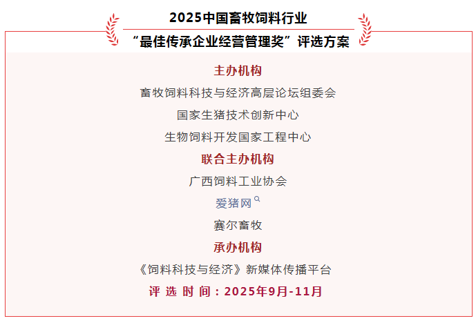 2025年,中國經濟恰處“十四五”收官與“十五五”謀篇開局的關鍵銜接點;中國畜牧飼料行業也正處于結構優化的關鍵期,產業發展模式正在進行切換。同時,行業企業正迎來企業傳承的關鍵轉折點,企業代際傳承能否成功,決定著行業未來的發展。中國畜牧飼料行業如何以榜樣的力量為正處傳承困局的企業提供切實可行的破局路徑?如何借助科技的力量實現可持續的發展?由畜牧飼料科技與經濟高層論壇組委會、國家生豬技術創新中心、生物飼料開發國家工程中心主辦的“2025中國畜牧飼料行業——最佳傳承企業經營管理獎、推動產業轉型的十大技術進步獎”評選活動,已經拉開了帷幕。并將于12月5-7日“2025 第22屆畜牧飼料科技與經濟高層論壇”舉辦之際進行頒獎儀式。
