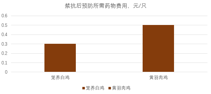 籠養白雞腸道健康預防所需藥物費用約0.1-0.3元/只,夏季費用略高;黃羽肉雞腸道健康預防所需藥物費用約0.3-0.5元/只,梅雨季節黃雞費用更高。相比飼料禁抗前,籠養白雞和黃羽肉雞針對腸道健康的藥物費用均有所增加,增加比例約為10-30%。