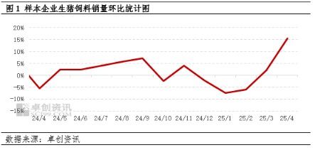 受春節假期影響,節前養殖端加速生豬出欄,生豬存欄減少,尤其大體重生豬集中出欄導致飼料需求下降,1-2月全國代表飼料企業豬料銷量連續下降。春節假期過后,養殖端壓欄增重情緒漸濃,大體重生豬存欄有所增加,飼料需求逐漸恢復,3月份生豬成品飼料銷量環比增幅2.16%,4月環比增幅15.52%,增幅達到2024年以來的最高水平。