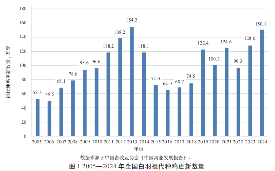 白羽種雞規模持續擴張,祖代、父母代種雞年度更新數量居歷史高位。根據中國畜牧業協會監測數據,2024年我國白羽肉雞祖代年度更新150.07萬套,較2023年增加17.25%,接近2013年154.16萬套的歷史最高位水平(圖1)。