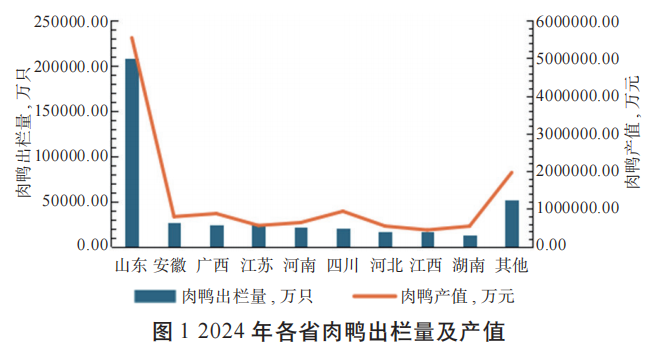 2024年我國23個肉鴨主產省的肉鴨出欄量和產值如圖1所示。就區域生產布局而言,肉鴨產業的區域集中度較高,主要集中在華東地區,其出欄量高達28.1億只,占全國總出欄量的66.6%。就省域生產布局而言,山東省的肉鴨出欄量和產值獨占鰲頭,其出欄量超過20億只,產值接近600億元,分別是排名第二位(安徽?。┑?.9倍與5.9倍。