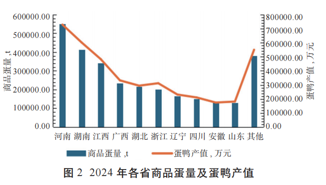 2024年我國23個蛋鴨主產省的鴨蛋產量和蛋鴨產值如圖2所示。就區域生產布局而言,我國蛋鴨主要生產區域布局華中和華東地區,其產蛋量和產值占比均超過全國的72%。