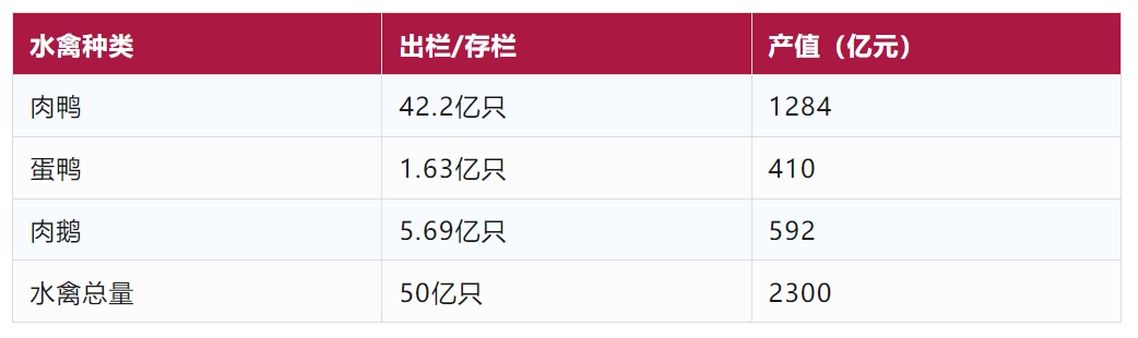 2024年全國水禽出欄量超過50億只,產肉量超過1200萬噸,總產值超過2300億元,較2023年增加5.2%。
