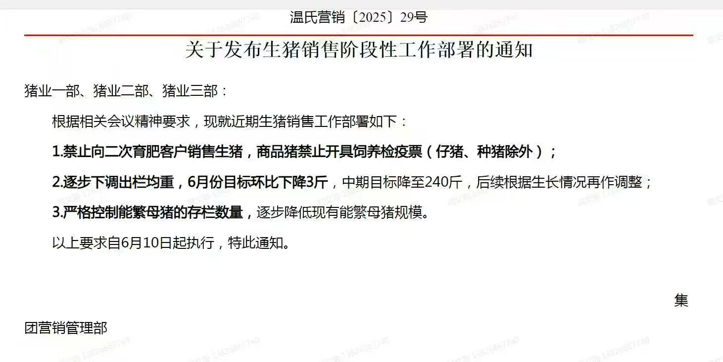 5月底,已有相關部門推動落后產能有序退出,多家頭部豬企接相關部門要求,暫停能繁母豬擴產,出欄體重也需要控制在120公斤左右。牧原股份當時曾向財聯社記者表示, “當前公司結合內外部情況,決定不對二次育肥客戶出售商品豬。”