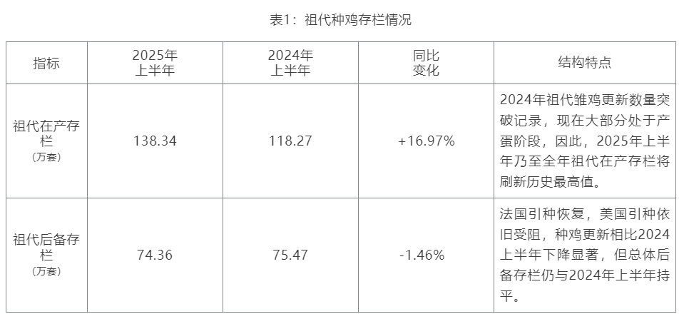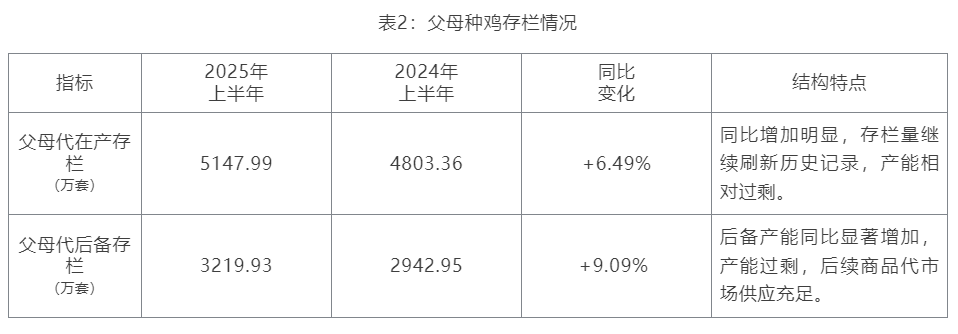 受前期父母代雛雞供給增加影響,今年上半年父母代存欄仍然延續前幾年的增長態勢。2025上半年,全國父母代種雞總存欄為8367.92萬套,同比增加7.47%,其中后備種雞存欄3219.93萬套,同比增加9.09%,在產種雞存欄5147.99萬套,同比增加6.49%。