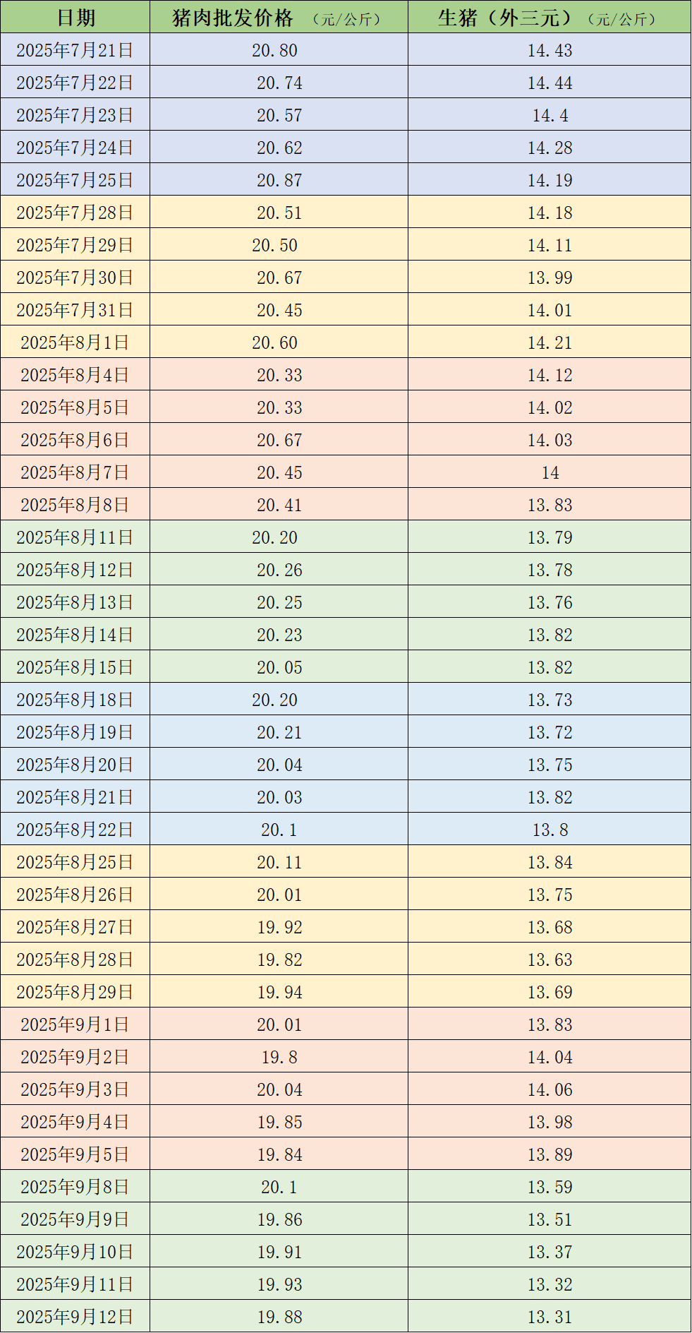 據農業農村部監測,9月12日,全國農產品批發市場豬肉平均價格為19.88元/公斤,與上周五(9月5日)的19.84元/公斤相比,上漲0.2%。本周的平均價格為19.94元/公斤,與上周19.91元/公斤的均價相比,上漲0.2%。