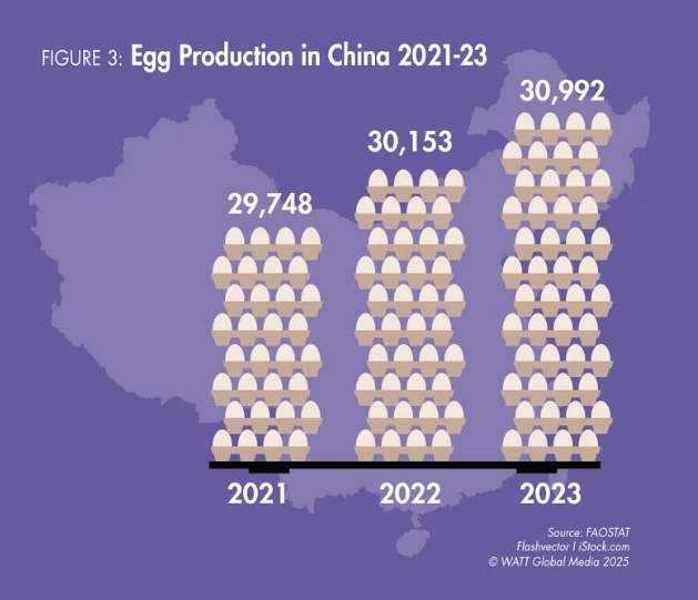 中國占全球雞蛋產量的49%。根據FAO的數據,自2021年以來,中國的雞蛋產量一直在穩步增長,到2023年達到近3100萬噸(圖3)。雖然中國大部分的雞蛋生產是常規的,但在該國無籠雞蛋的市場也在不斷增長。