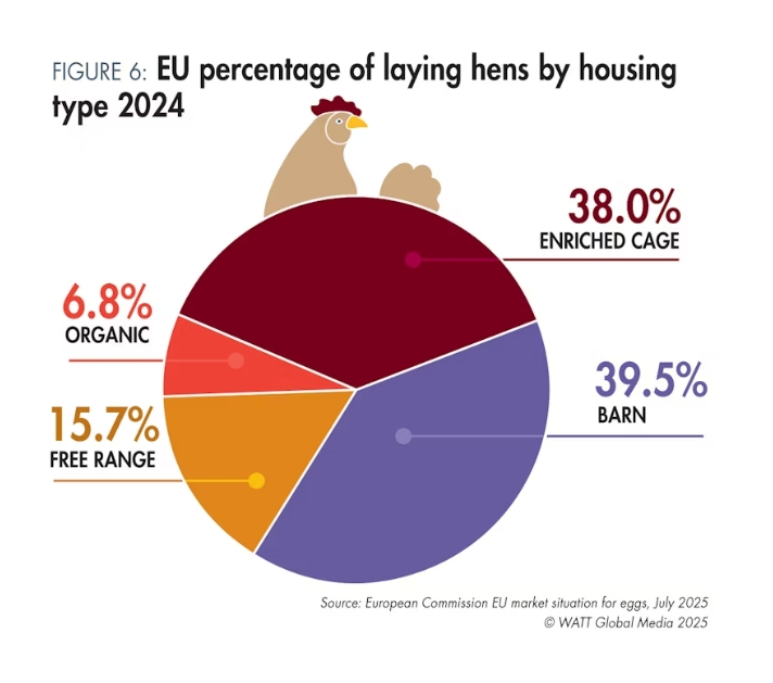 根據歐洲委員會的數據,2024年,歐盟38%的蛋雞被關在豐容籠中,超過39%的蛋雞被關在雞舍或無籠環境中,近16%的蛋雞被關在散養環境中(圖6)。