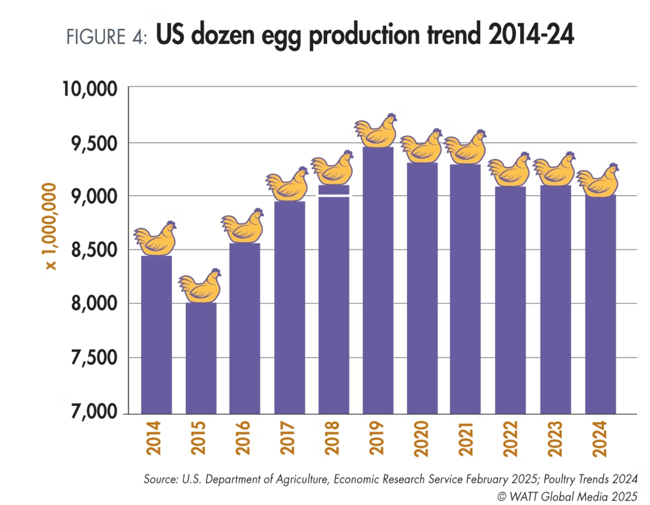 根據美國農業部(USDA)的數據,2019年雞蛋產量達到94億打的峰值后,美國的雞蛋產量略有下降,2024年降至約90億打。美國農業部(USDA) (圖4)。