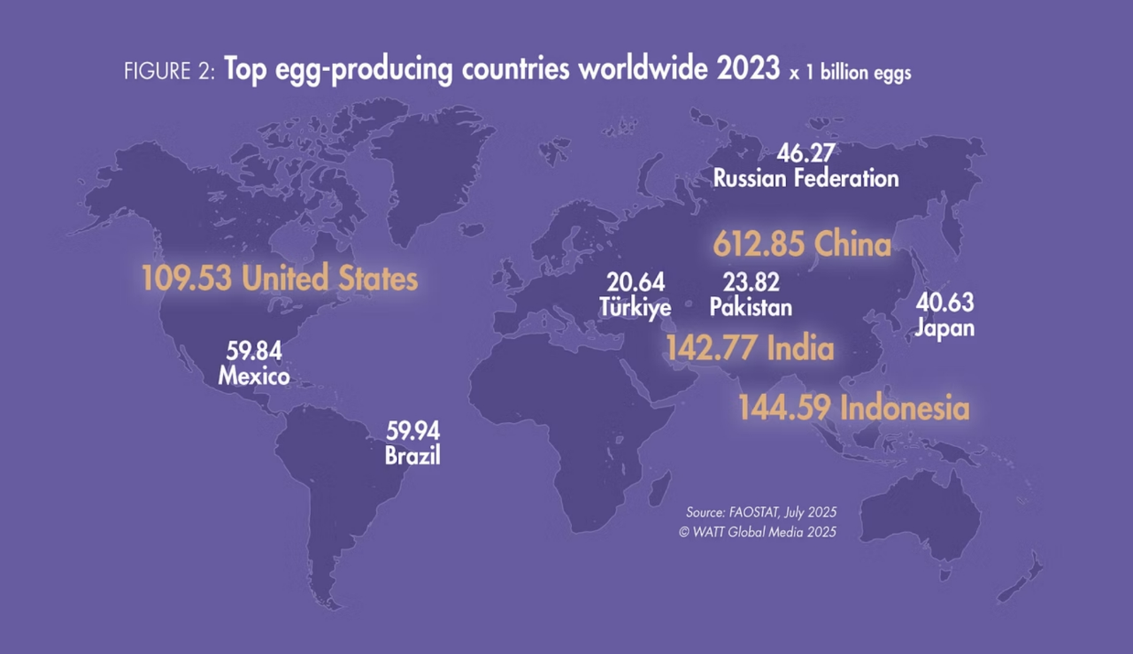 中國繼續生產最多的殼雞蛋,2023年產量超過6120億顆。同年,中國的產量超過了印度尼西亞、印度、美國、巴西、墨西哥和俄羅斯聯邦等六個國家的總和。