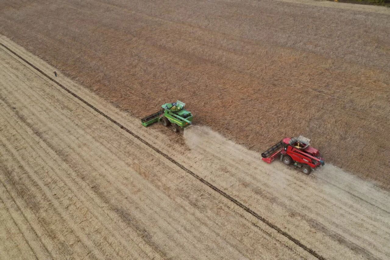 圖為黑龍江省雙鴨山市大豆田機械化收割現場。張蘭 攝