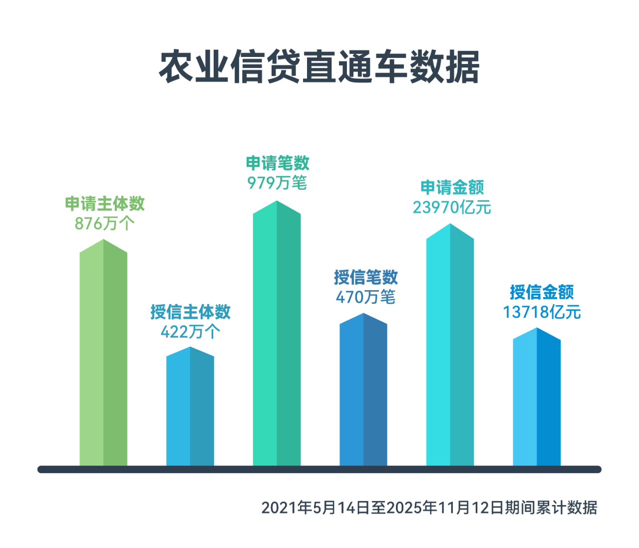 信貸融資方面,2021年,農業農村部啟動農業經營主體信貸直通車活動,從2021年5月14日至2025年11月12日,已有876萬個農業經營主體通過信貸直通車申請貸款,申請金額23970億元,累計授信470萬筆,授信金額13718億元。