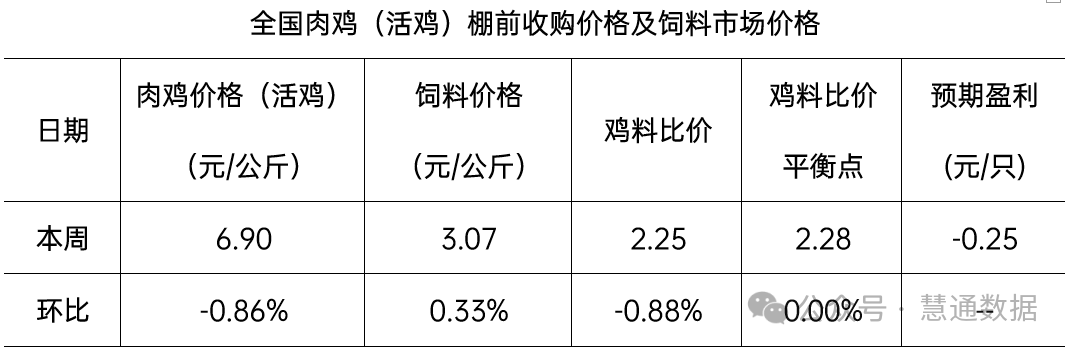 本周全國雞料比價為2.25,環比下跌0.88%。按目前價格及成本推算,未來肉雞養殖預期虧損0.25元/只。