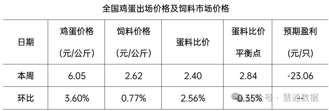 本周全國蛋料比價為2.40,環比上漲2.56%。按目前價格及成本推算,未來蛋雞養殖每只虧損23.06元。