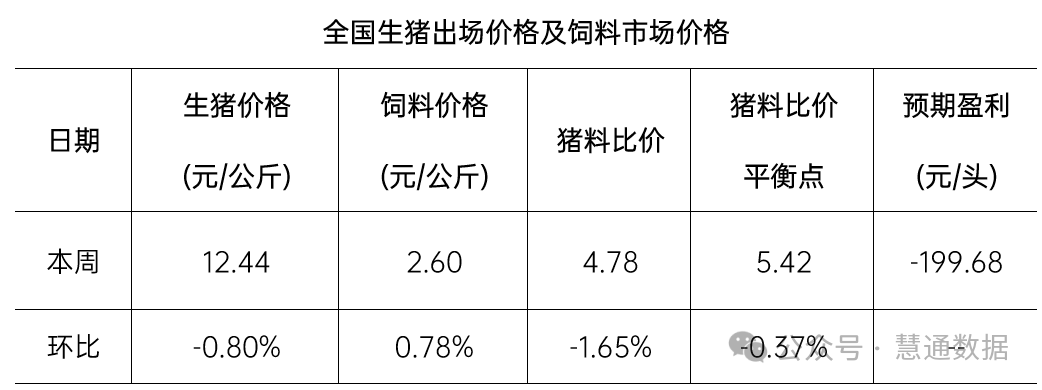 本周全國豬料比價為4.78,環比下跌1.65%。按目前價格及成本推算,未來仔豬育肥模式的生豬養殖頭均盈利為-199.68元。