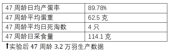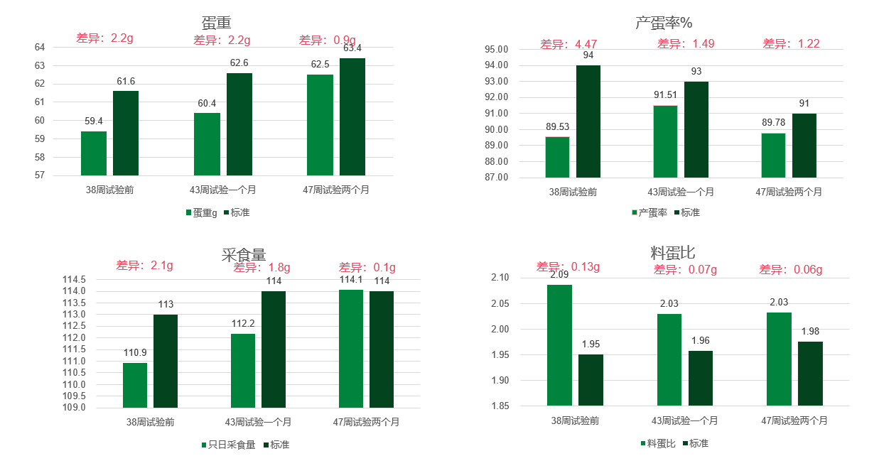 經過兩個月的試驗,蛋重與產蛋率與標準改善較多,逐步接近標準,采食量已經恢復到標準,料蛋比顯著降低,整體經濟效益得到提升。