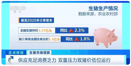 而供應端的壓力仍在,由于前兩年生豬養殖效益較高,行業產能出現擴張。農業農村部的數據顯示,截至2025年三季度末,全國生豬存欄4.37億頭,同比增長2.3%。前三季度全國生豬出欄5.3億頭,同比增長1.8%。截至2025年10月末,全國能繁母豬存欄3990萬頭,時隔17個月重回4000萬頭以下,但仍然超過3900萬頭的正常保有量。