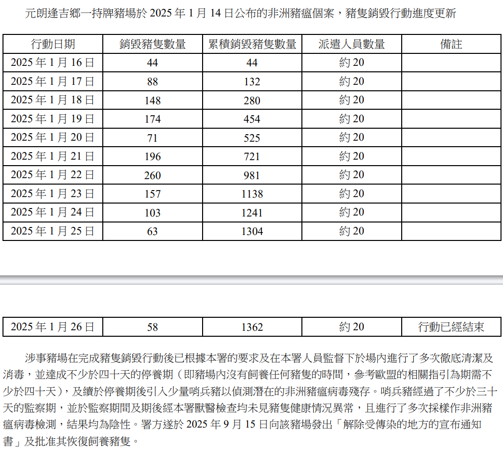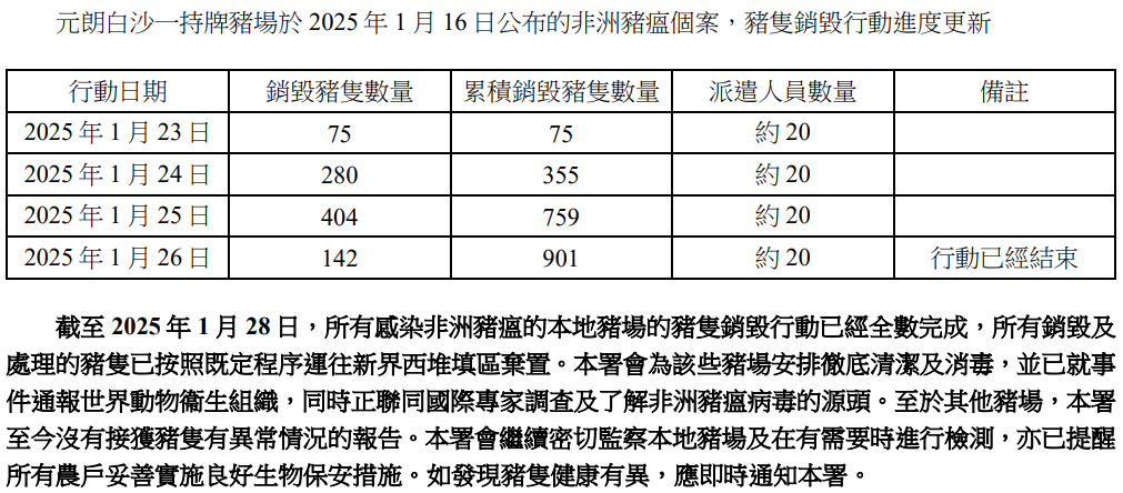 截至目前,涉事豬場已全面禁運,豬只銷毀行動正在有序推進,累計銷毀豬只978頭,所有銷毀豬只均按規范運往新界西堆填區無害化處理。
