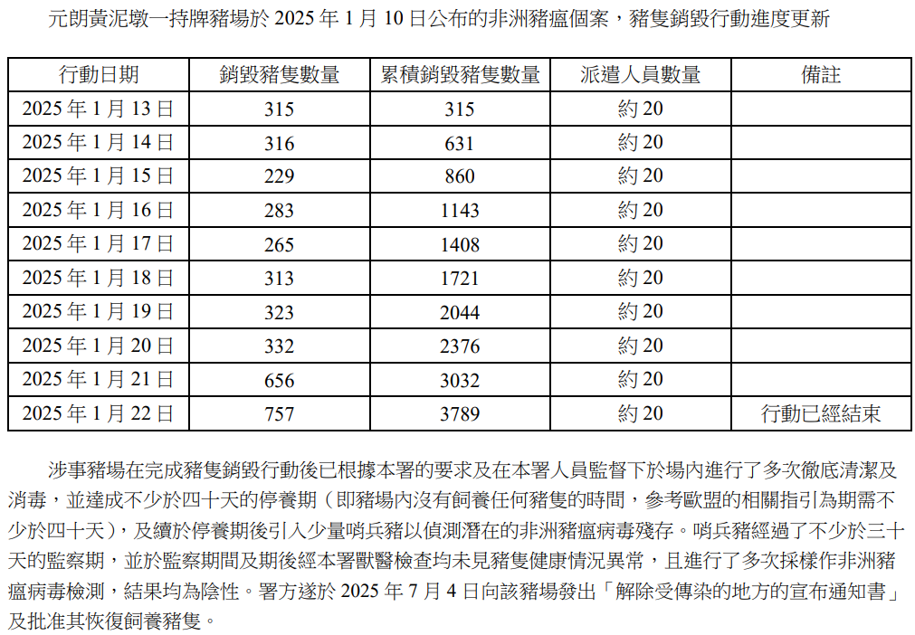 2025年的香港養豬業,始終在與非洲豬瘟的拉鋸中前行。年初,元朗黃泥墩、逢吉鄉、白沙三家豬場就先后暴發疫情,累計銷毀豬只超6000頭。其中黃泥墩豬場的銷毀行動持續10天,累計銷毀3789頭,創下年內單場銷毀數量之最。