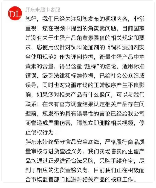 胖東來回復表示,針對視頻中提到的角黃素“超標”問題,目前國家并沒有關于生蛋產品角黃素限值的相關規定和要求,使用僅針對飼料添加劑的《飼料添加劑安全使用規范》作為評判依據,衡量生蛋產品中角黃素的含量,得出含量“超標”的結論,適用標準錯誤,缺乏法律和標準依據,已給社會公眾造成誤導,同時也對雞蛋市場的正常秩序產生不良影響。