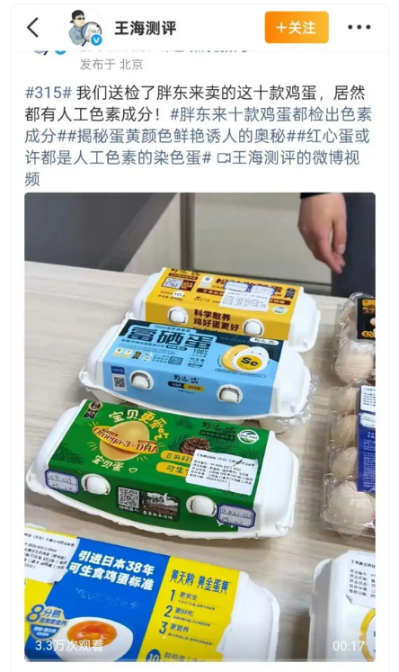 3月13日,知名打假人王海團隊公開爆料稱,送檢了胖東來賣的十款雞蛋,均檢出人工角黃素(斑蝥黃),直指品牌涉嫌虛假宣傳。其中一款雞蛋還是黃天鵝。