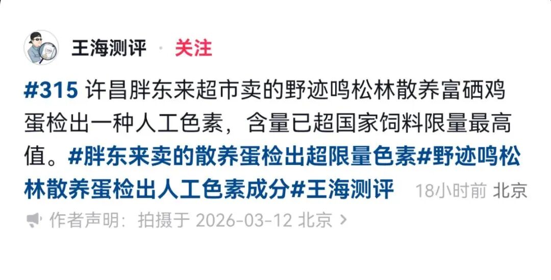13日,博主“王海測評”發視頻稱,許昌胖東來超市的雞蛋檢測出一種名為角黃素(斑蝥黃)的人工色素,含量為9.54mg/kg,超出農業農村部發布的《飼料添加劑安全使用規范》蛋禽類飼料中斑蝥黃允許的最大添加量8mg/kg,存在一定的食用安全隱患。