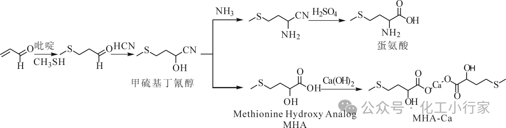 化學合成法的核心優勢在于其原料多為石化工業初級產品,來源廣泛、價格可控,工藝總收率可穩定在80%以上。核心路線均以丙烯醛、甲硫醇為基礎原料,先接入甲硫基基團,再生成羧基與氨基基團,最終制得蛋氨酸成品。