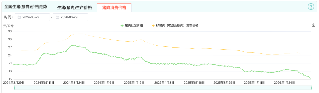 農業農村部監測信息顯示,3月20日-26日,全國豬肉平均批發價格為7.92元/斤,環比下降1.9%,2025年同期為10.34元/斤,同比下降23.4%。