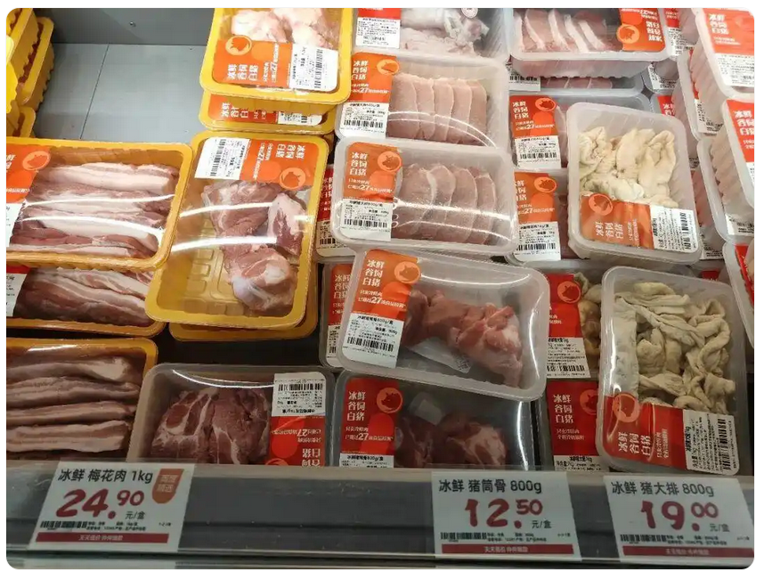便宜到什么程度?以上海市一家大潤發超市為例,其售賣的帶皮去骨前腿肉每斤僅6.99元。同一商圈的盒馬NB,800克裝的冰鮮豬筒骨每盒售價也僅12.5元。