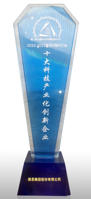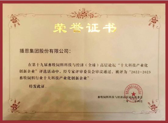 2023年4月19日,第十九屆畜牧飼料科技與經濟(全球)高層論壇頒獎盛典在河南如期舉行,播恩集團憑借優秀的科技創新能力和成果轉化能力,榮獲“十大科技產業化創新企業”獎。