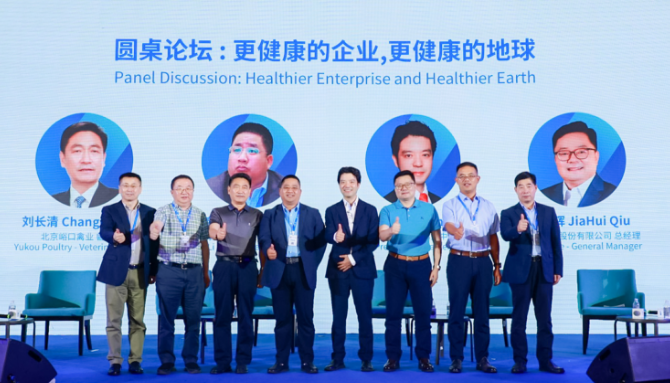 精彩的報告分享結束后,作為本屆高峰論壇的壓軸節目,以“更健康的企業,更健康的地球”為主題的圓桌論壇隨之展開,在禮藍動保家禽業務銷售總監才鳳峰的主持下,禾豐食品股份有限公司總裁邱嘉輝、黑龍江北三峽食品有限公司總裁寧召峰、山東海陽鼎力種雞有限公司總經理鞏新民、江蘇益客集團副總裁王維、北京峪口禽業獸醫總監劉長清、四川德康農牧集團技術總監翟浩、以及禮藍動保亞洲區副總裁/大中華區總經理陸智斌就相關話題展開了熱情洋溢的互動與交流,大家暢所欲言,現場氣氛十分熱烈。