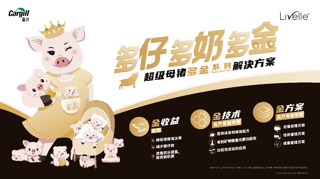 面對國內缺少專用的高產母豬解決方案的現狀,2022年6月8日,嘉吉動物營養“超級母豬多金系列解決方案”震撼上市,該方案聚焦解決農場在飼養丹系、法系等高產母豬時常出現母豬淘汰率高,仔豬出生體重小、弱仔多,斷奶體重小,哺乳成活率低等問題,通過整合嘉吉全球研發技術和實踐經驗,專門針對丹系、法系等高產母豬(PSY>26+)研發,緊扣高產母豬基因需求和生產規律,充分挖掘高產母豬生產潛能,讓高產母豬真高產,打造農場金收益。