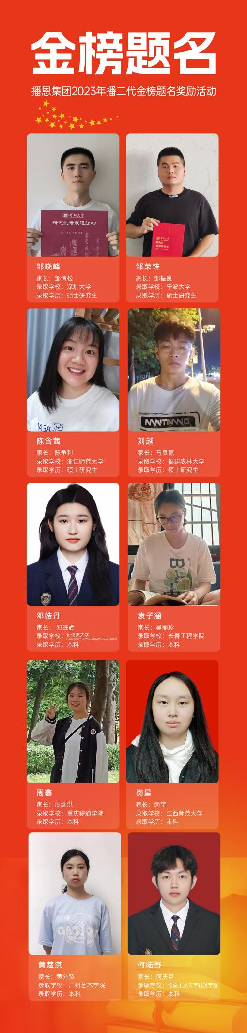 致辭結束后,就來到了最激動人心的金榜題名頒獎環節。本次活動,播恩集團為今年考取大學的10位播二代頒發了「播二代金榜題名獎學金」。