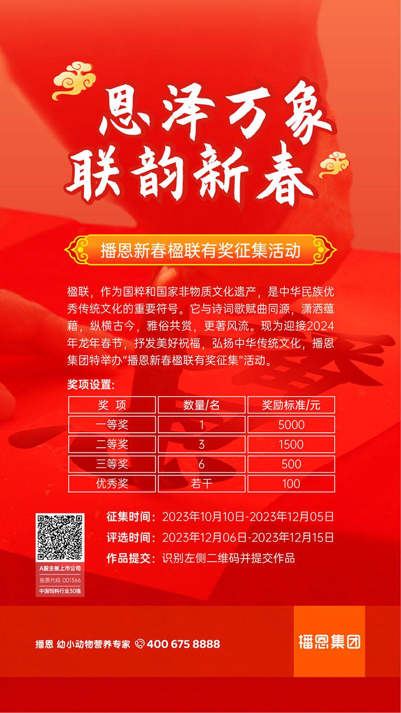 揮毫筑夢,一字千金。播恩新春楹聯有獎征集,最高獎金5000元,快來參加,發揮你的創意,讓你的楹聯成為新春佳節的焦點!