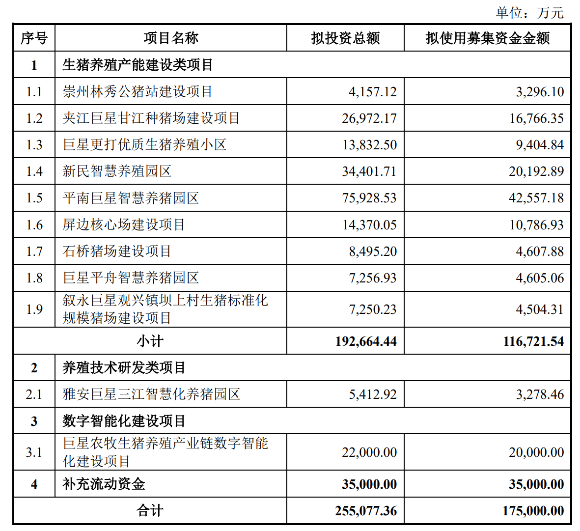 項目可行性分析報告顯示,上述募投項目中的生豬養殖產能建設類項目包含九個子項目,擬投資總額19.27億元,擬投入募集資金11.67億元。