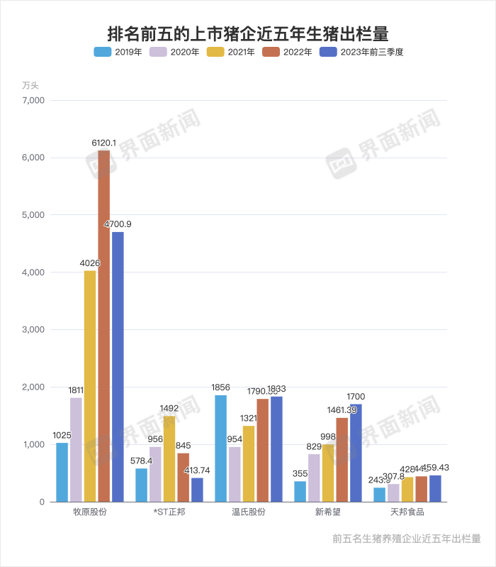 此后,牧原股份延續著大躍進式的發展,出欄量持續爆發,2022年,牧原出欄生豬6120.1萬頭,超過另外4家頭部競爭對手——溫氏股份、新希望、雙胞胎、正大出欄量之和。而到2023年,其生豬出欄量已預計高達6500萬-7100萬。