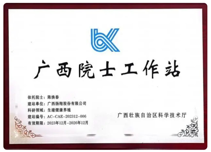 近日,廣西壯族自治區公布2023年度第四批廣西院士工作站備案名單,揚翔股份申報的“廣西揚翔股份有限公司生豬健康養殖廣西院士工作站”順利通過2023年度廣西壯族自治區院士工作站備案。