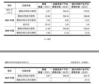 2019、2021年,櫻桃谷向桂柳系客戶銷售的櫻桃谷鴨祖代雛鴨價格也高于境內同類產品平均銷售價格,圖片:招股書